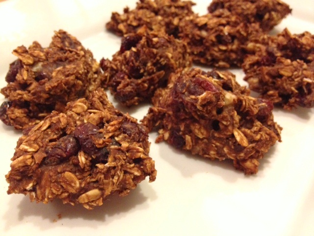 Let’s just say that they are flippin amazing, so easy to make, and crazy convenient for taking on the go. I used my little magic bullet wannabe blender to mix up the dry ingredients and bananas (seemed easier than mashing with a fork). Toss in the oats, cranberries and almonds and you’ve got yourself some batter. Use a spoon to throw some dollops on a baking sheet, toss them in the oven at 350 degrees for 15 minutes and BAM…you’ve got yourself a stupid good snack, breakfast, pre-workout meal, traveling clean eat, or even dessert (uhhh hello vanilla ice cream on top).